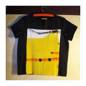 染め布デザインと麻生地の半袖ブラウス☆希少な一点もの